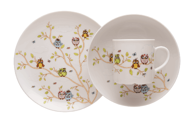 Kindergeschirr Set 3tlg. Porzellan Geschirrset mit lustigen Eulen für Mädchen und Jungen ab 3 Jahre