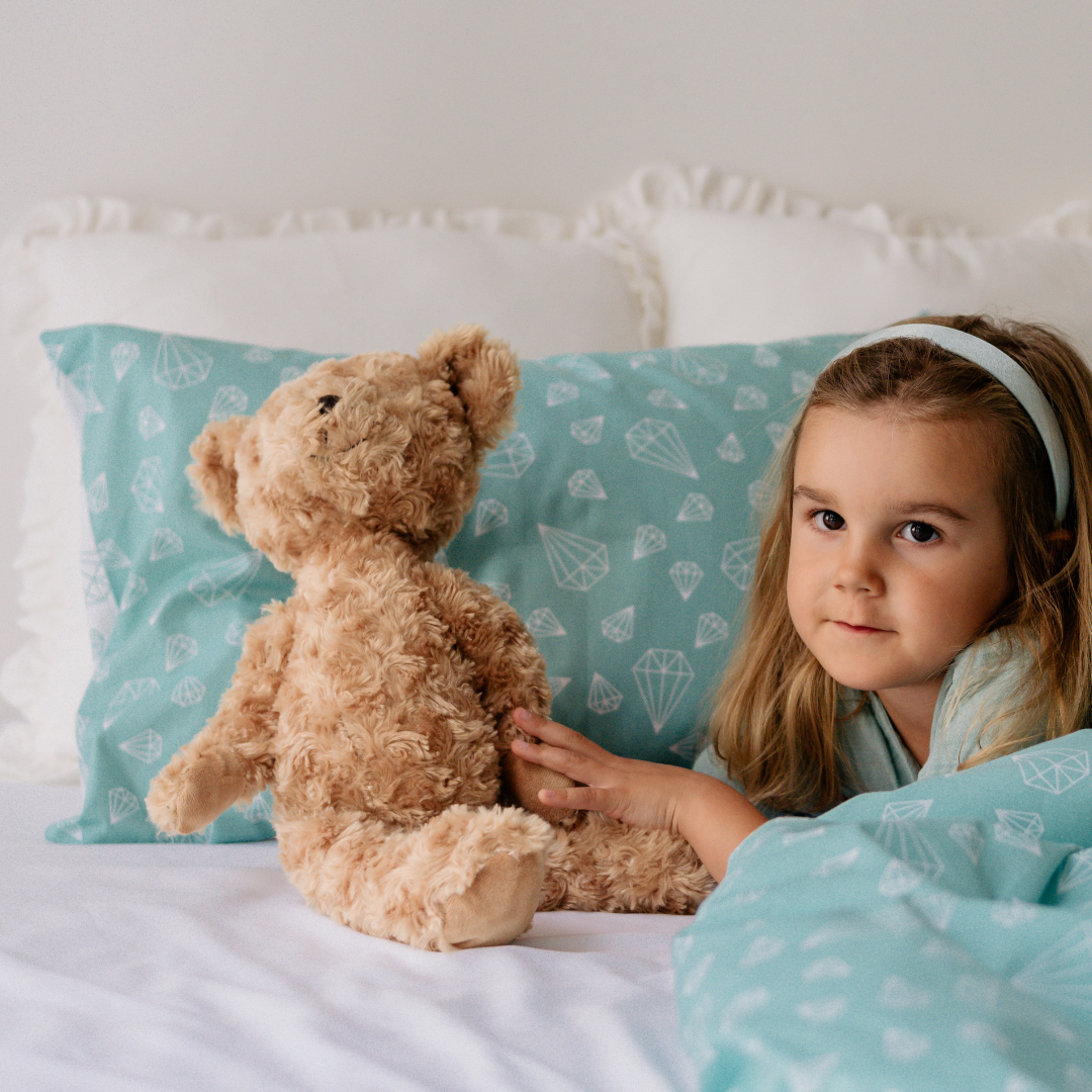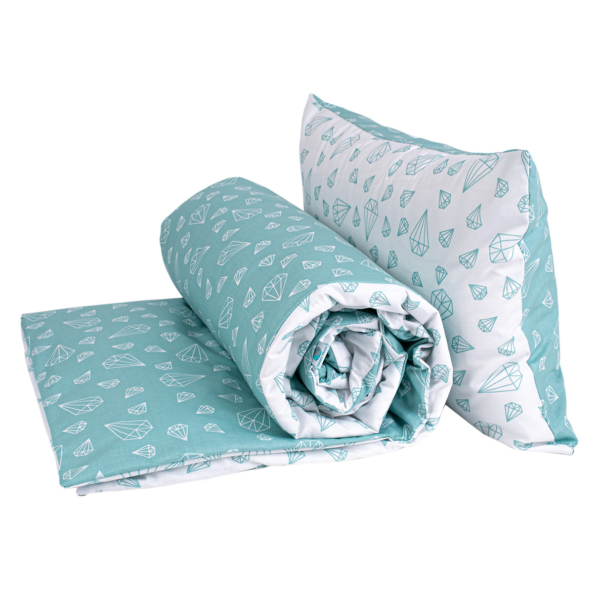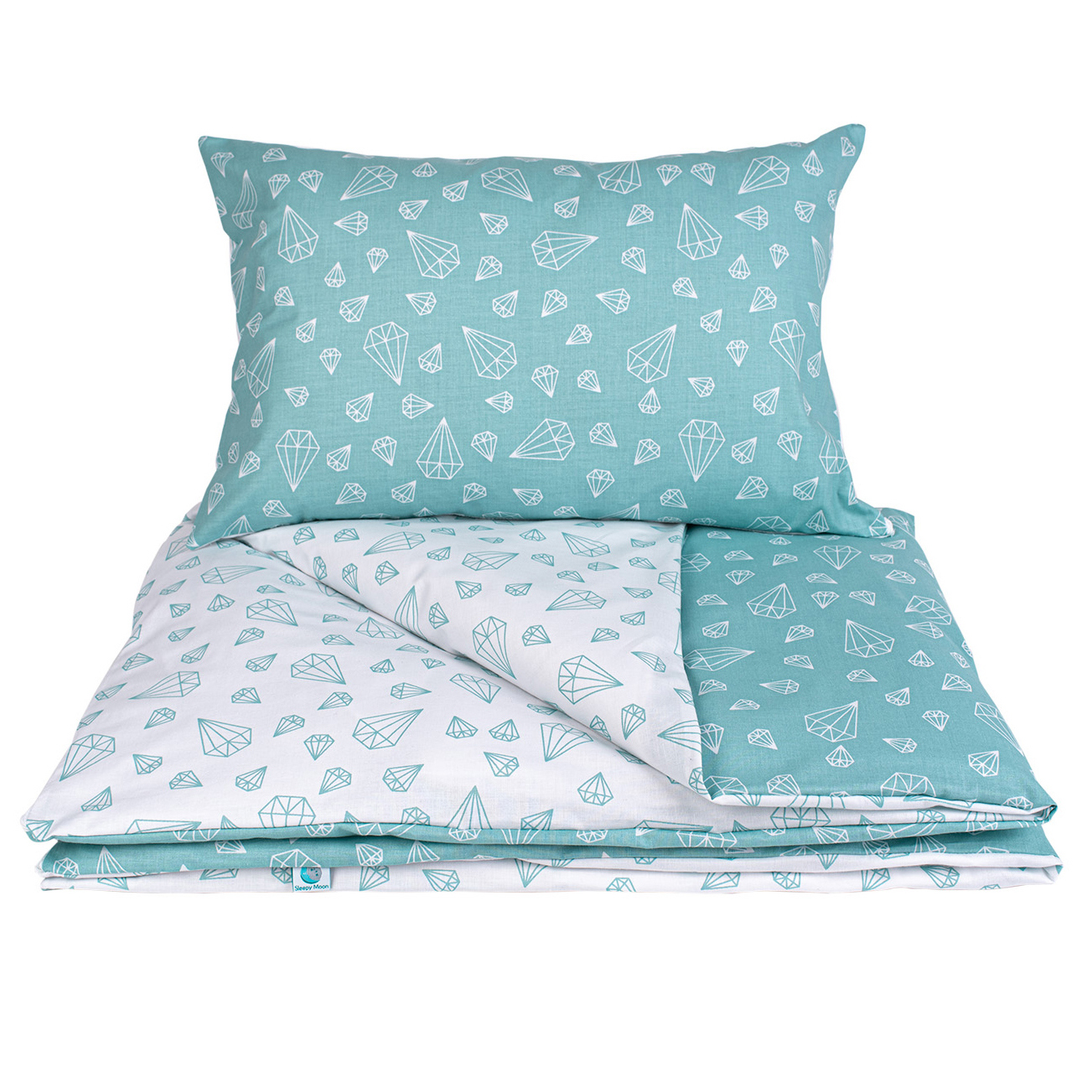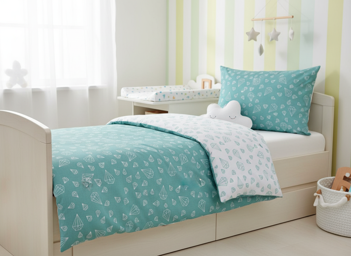 Kinderbettwäsche 140×200 aus 100% Baumwolle – Türkis Weiß mit Diamanten Motiv
