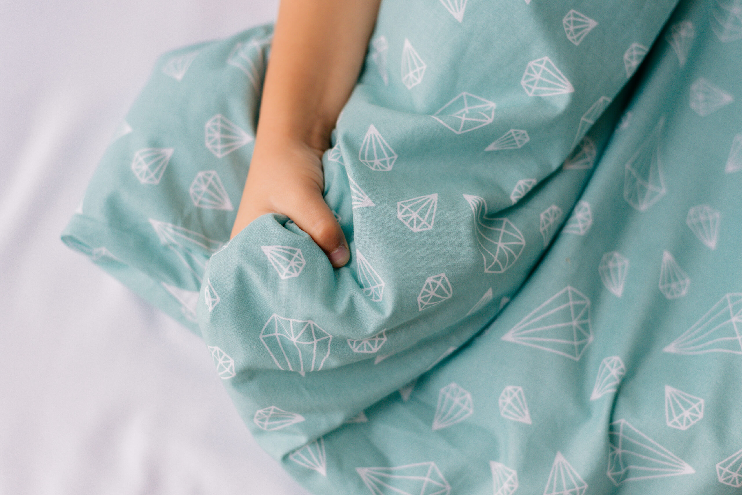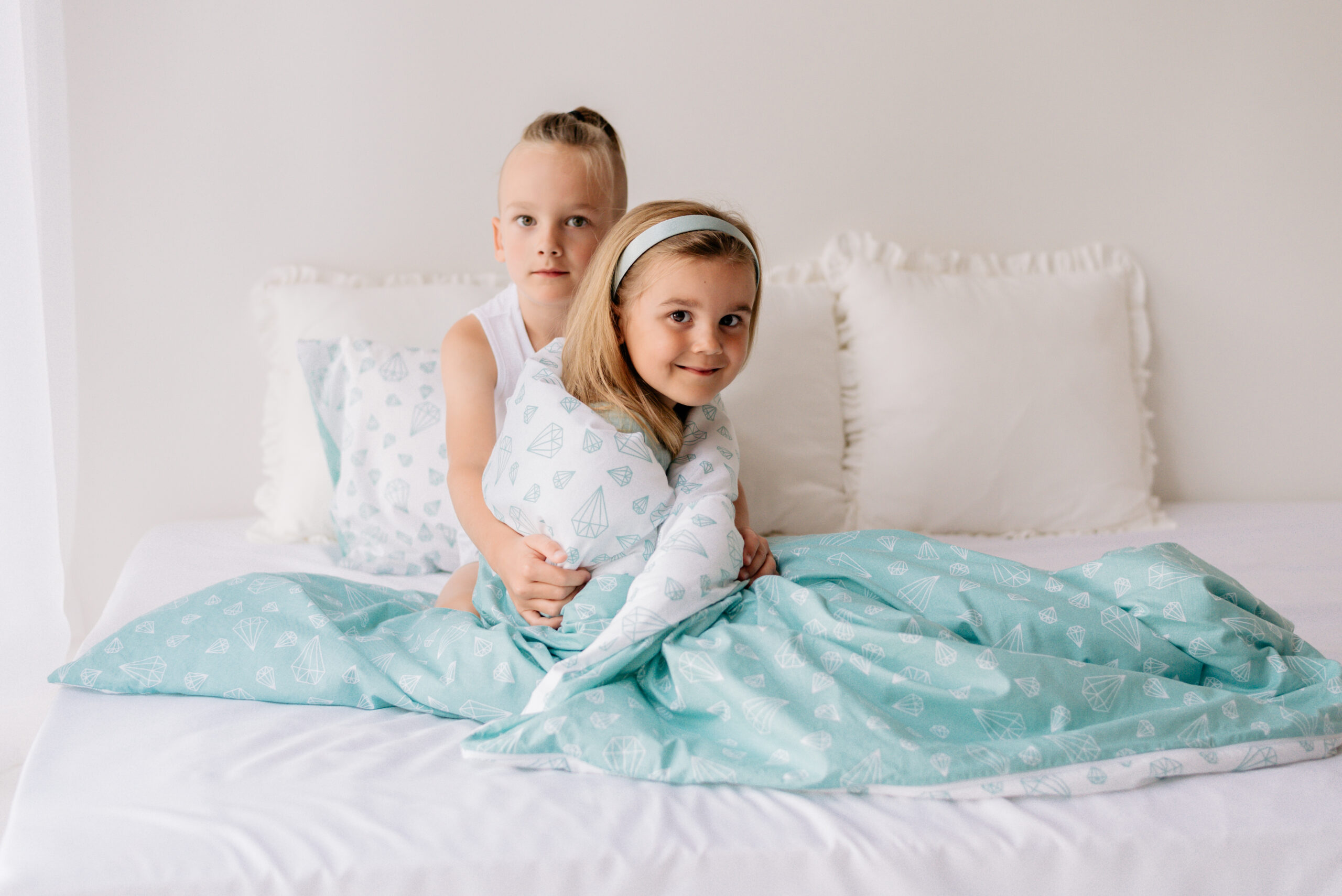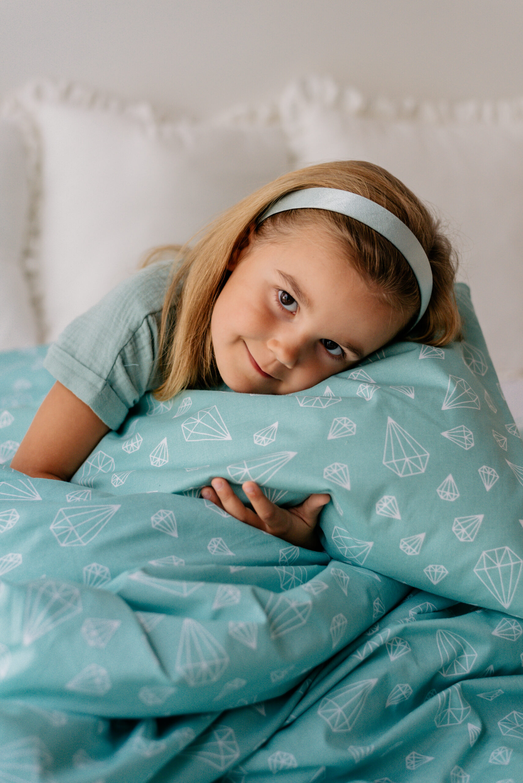 Kinderbettwäsche 140×200 aus 100% Baumwolle – Türkis Weiß mit Diamanten Motiv